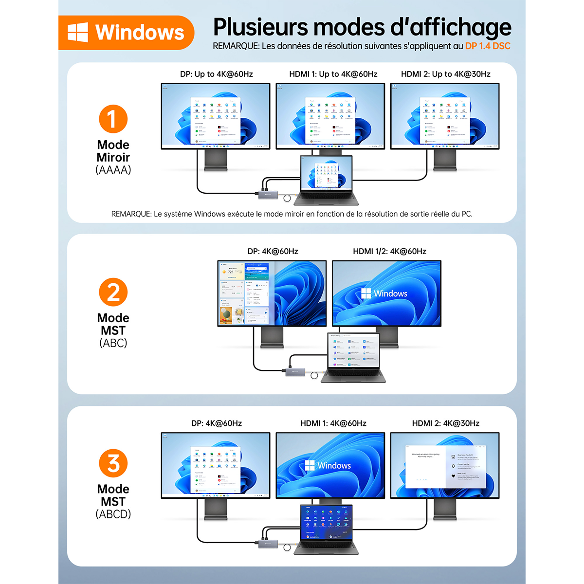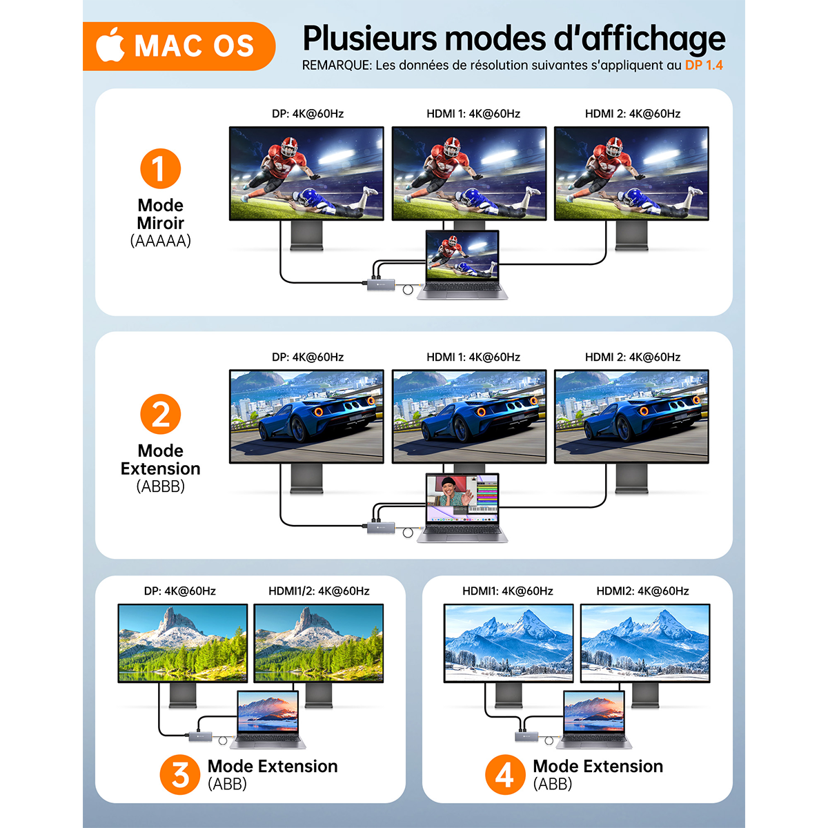 💻 Connectivité complète 14-en-1 – Transformez un seul port USB-C en une solution tout-en-un : 2 HDMI 4K@60Hz, 1 DisplayPort 8K@30Hz, 5 USB-A, 1 USB-C (5 Gbps), 1 port PD 100W, Ethernet RJ45, prise audio 3,5 mm et lecteurs de cartes SD/TF.