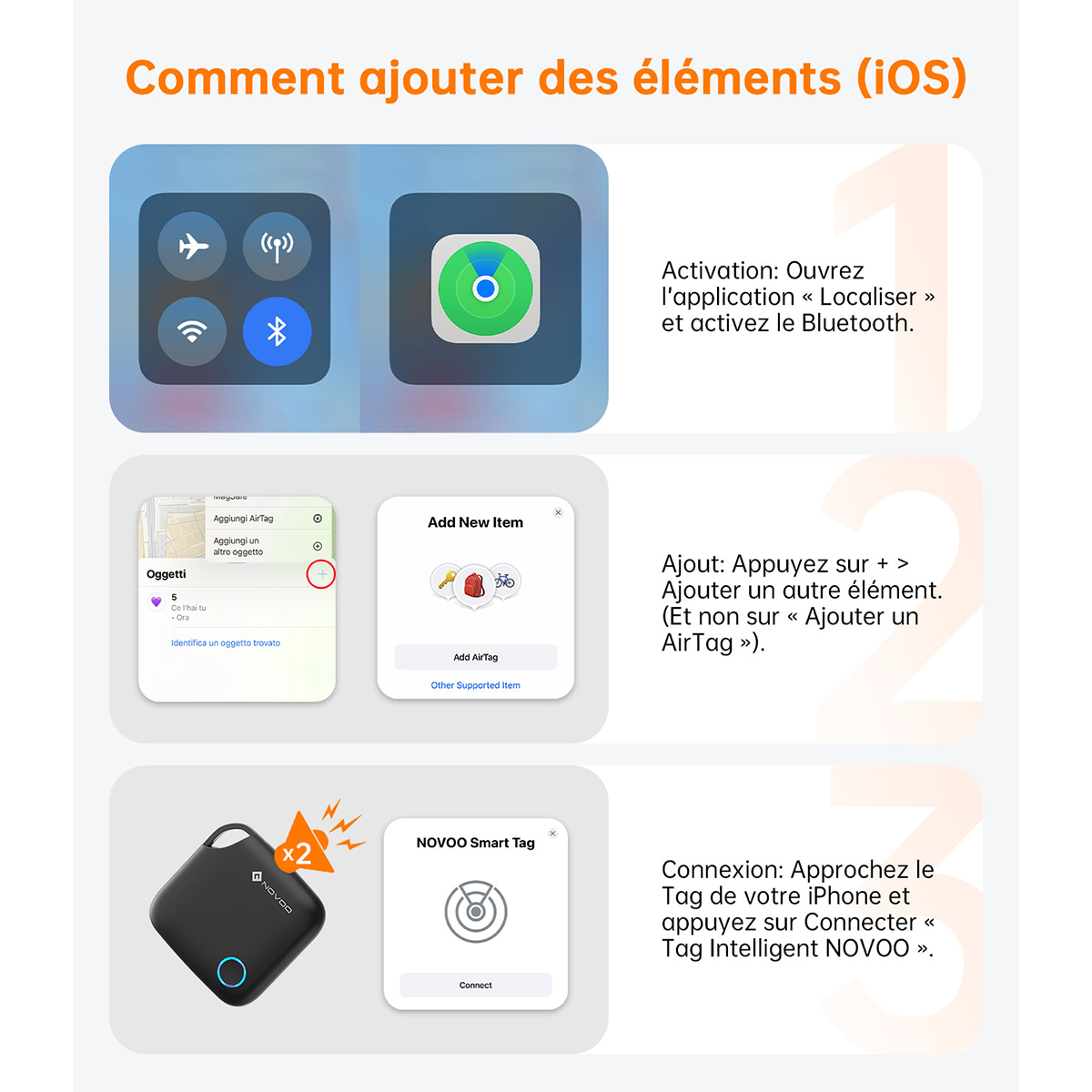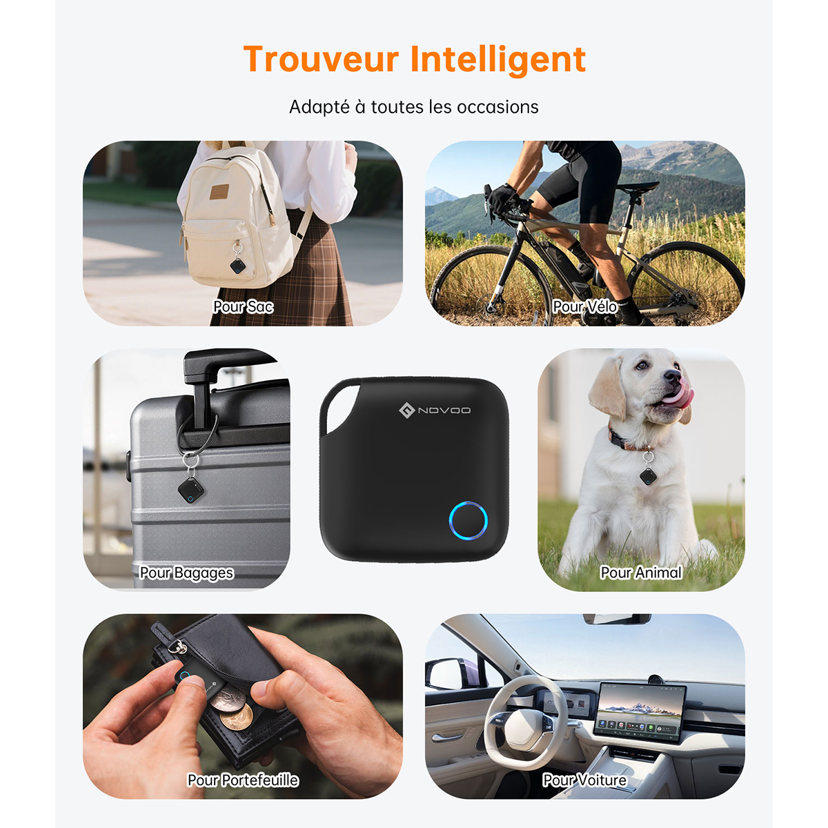 Nom du produit : NOVOO Smart Tag Modèle/SKU : NATS-101 Portée du signal : ≥40m (≥131 pieds), selon l'environnement Température : -15°C à +50°C (5°F à 122°F) Alerte sonore : 60-80dB Matériau : PC & Silicone Dimensions : 3231,59mm
