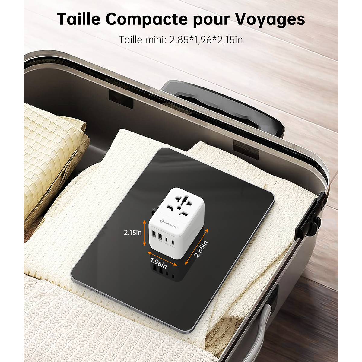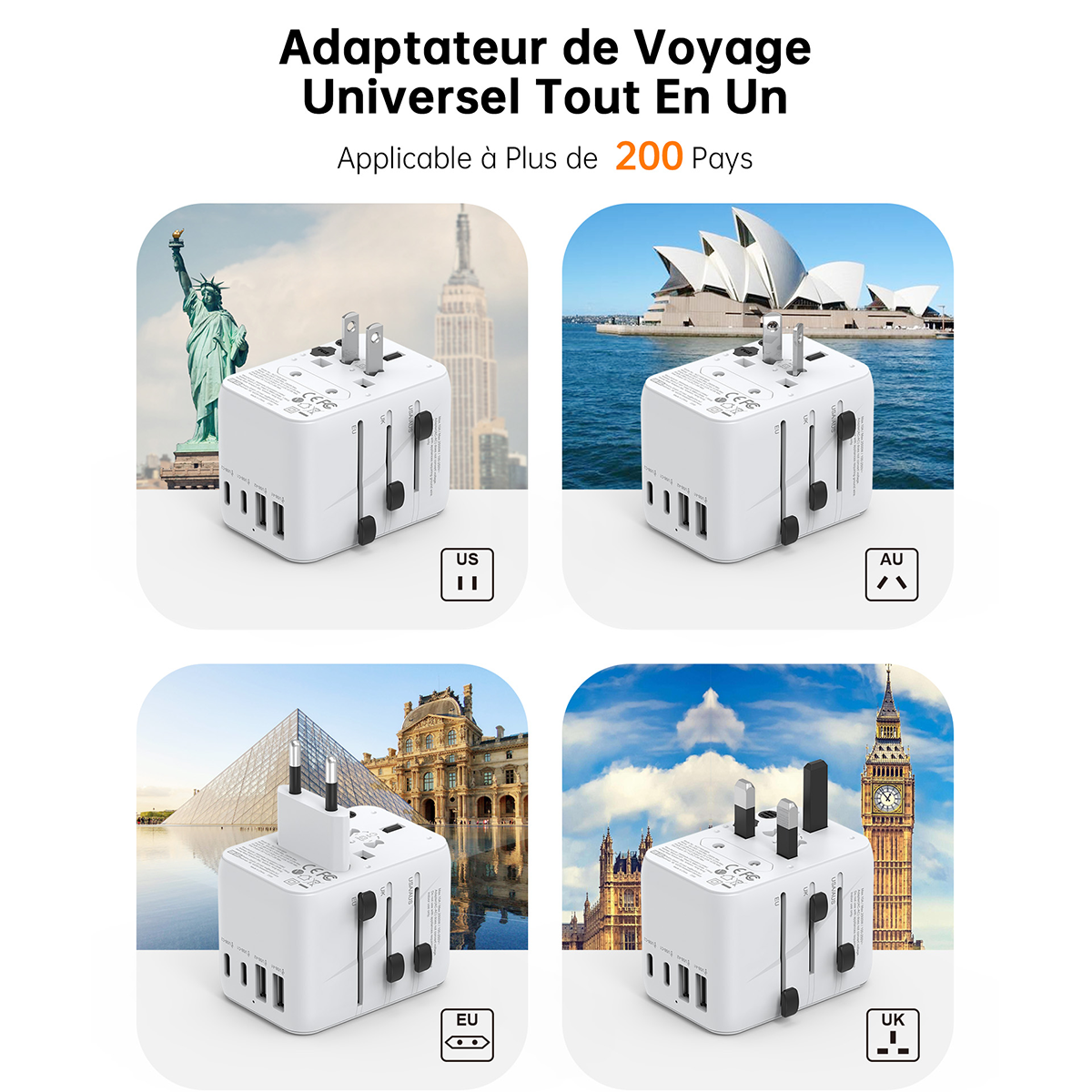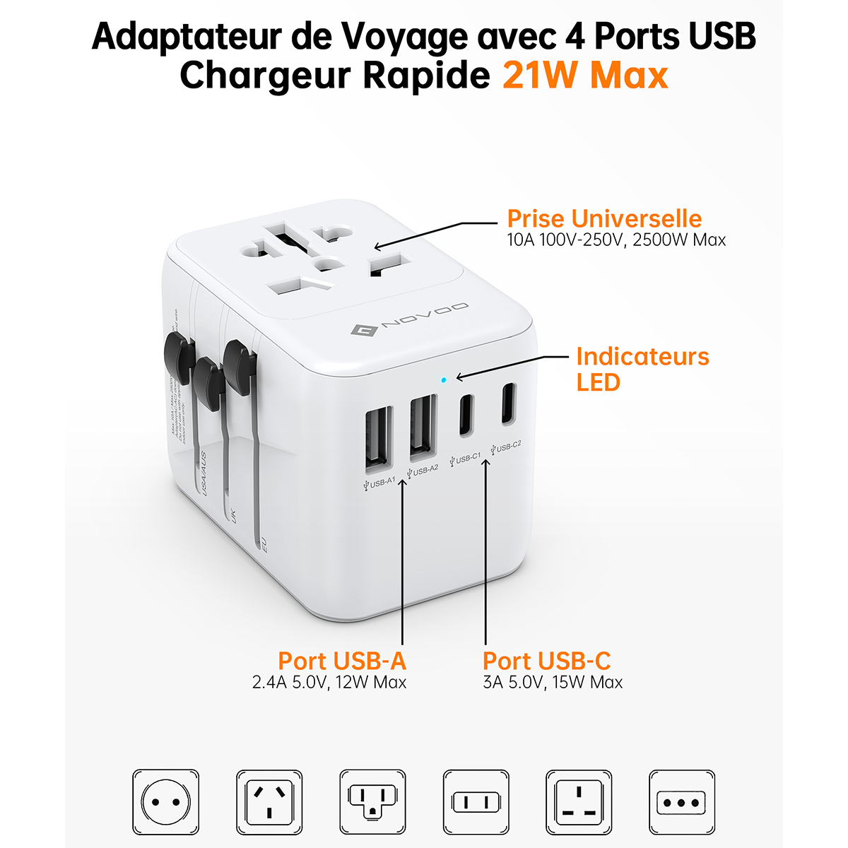 Description : Partez à l’aventure l’esprit tranquille avec l’adaptateur de voyage universel NOVOO. Conçu pour les globe-trotteurs et les professionnels nomades, cet accessoire indispensable vous permet de brancher vos appareils dans plus de 200 pays (USA, UK, Europe, Australie, Japon, Chine, etc.).