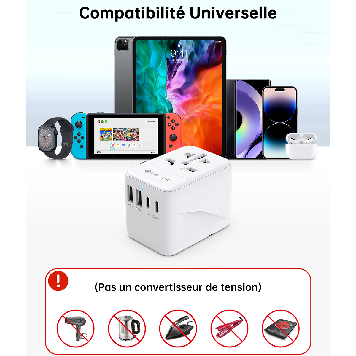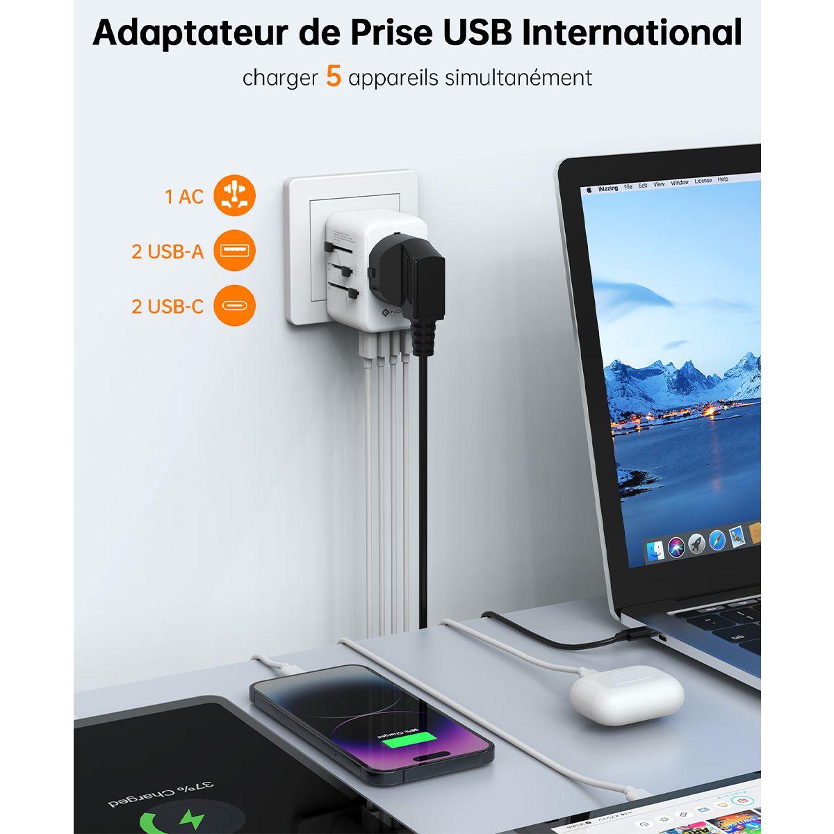 🌍 Compatibilité Mondiale : Un seul boîtier pour remplacer tous vos chargeurs. Idéal pour vos déplacements à l’hôtel, à l’aéroport ou en espace de coworking.