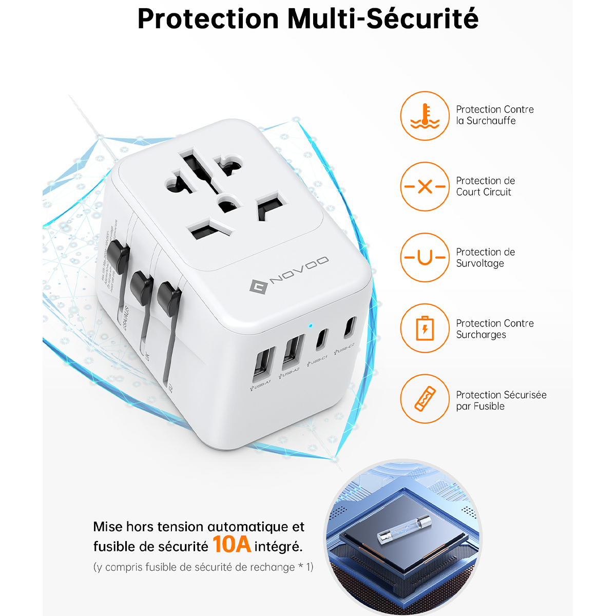 🛡️ Sécurité Maximale : Certifié FCC, CE et RoHS. Il intègre un double fusible de 10A et un système de protection contre les surcharges et les courts-circuits pour protéger vos précieux appareils.