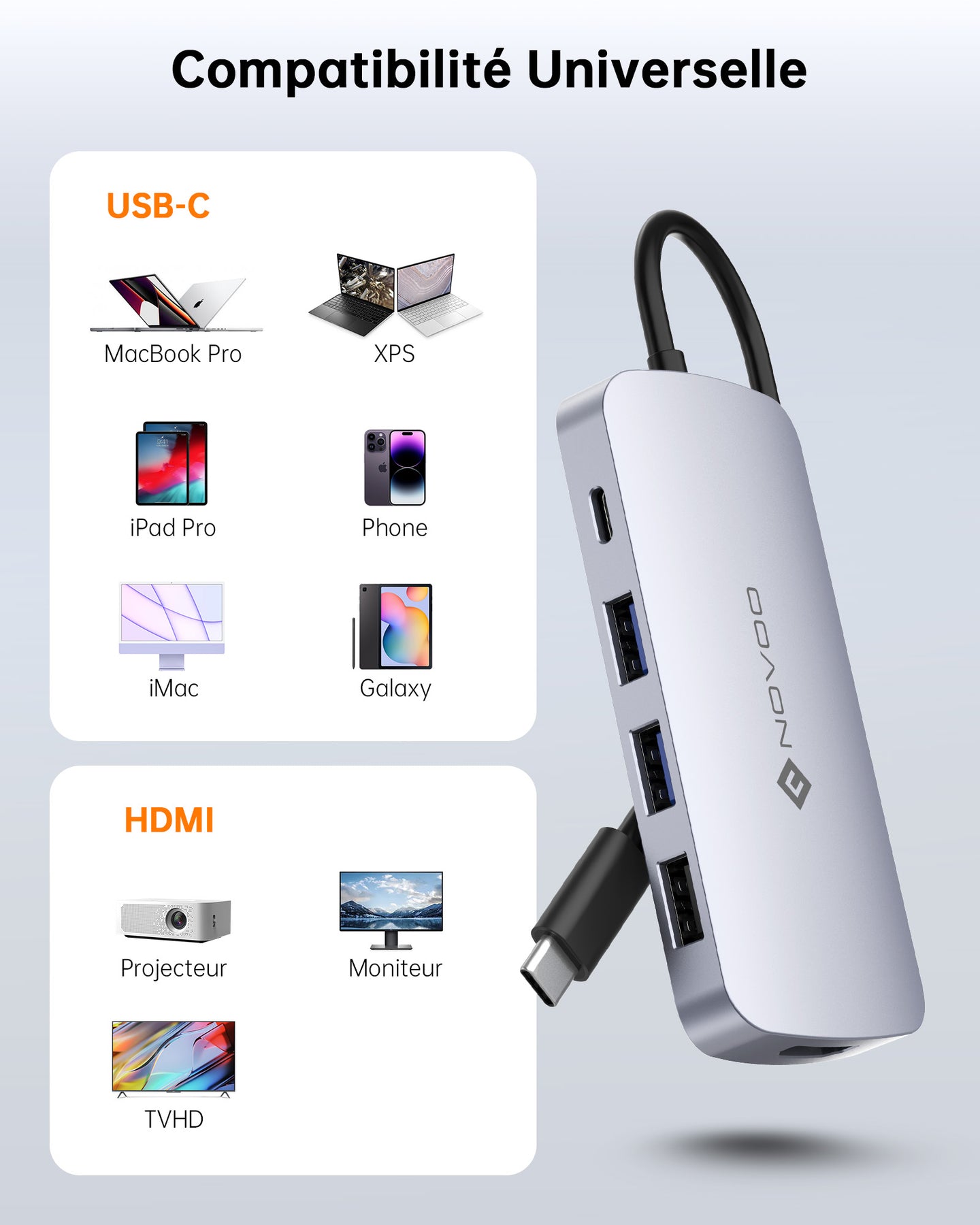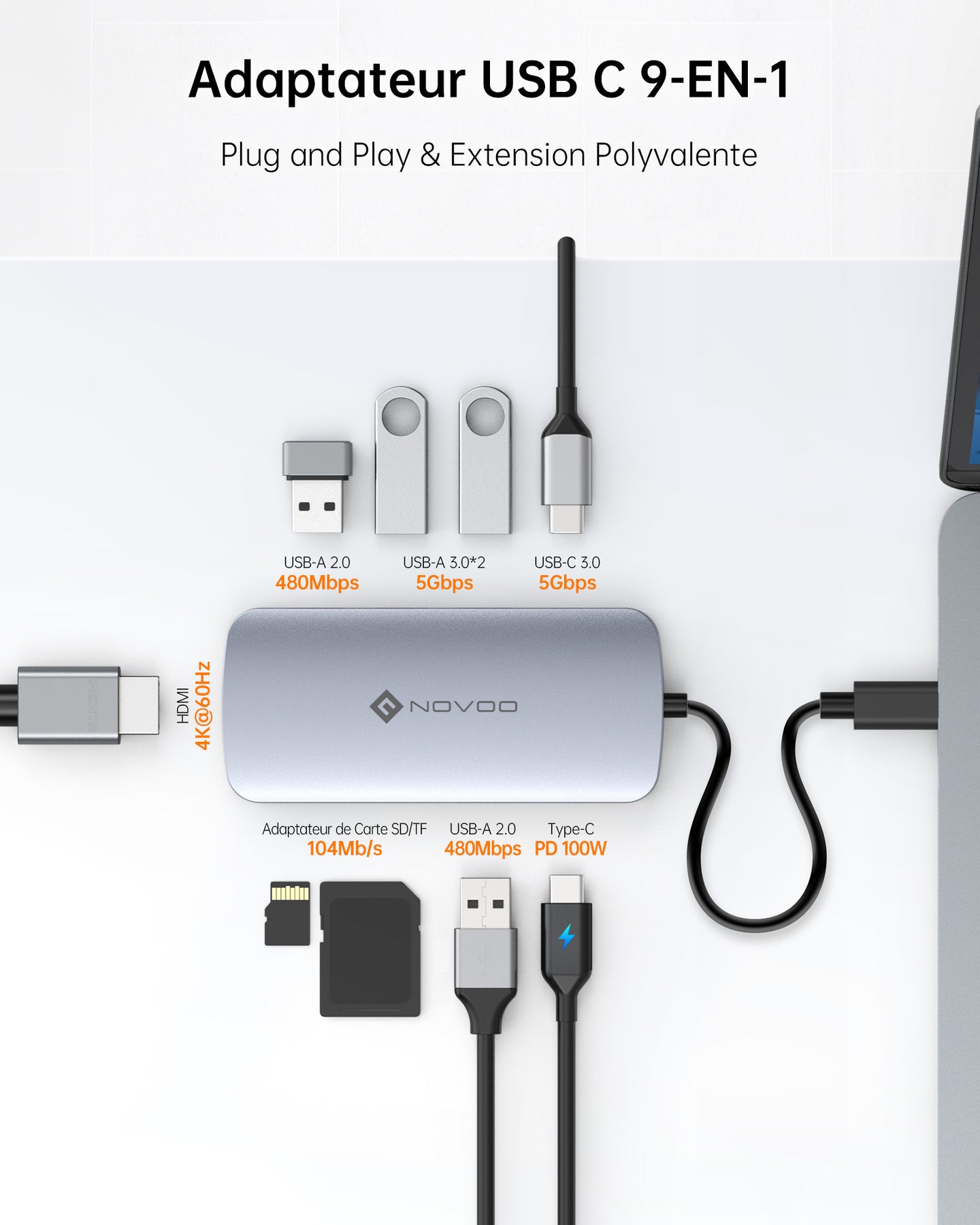 Hub 9-en-1 polyvalent – HDMI 4K@60Hz, 4× USB-A, 1× USB-C, lecteur SD/TF, PD 100W.